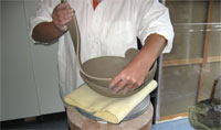 Die Schalen werden mit einem hochschamottierten Spezialton aus gewalzten Tonrollen aufgebaut und mit Modellier-Schienen geglättet. Wenn die Schalen angetrocknet, aber noch plastisch sind - also noch in einem lederharten Zustand - werden die Oberflächen poliert. Anschließend erfolgt der erste Brand bei 900°C (der sogenannte Schrühbrand).
