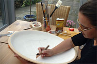 Auf die geschrühten Schalen wird nun das Dekor aufgebracht: zunächst mit Klebeband (Scherenschnitt) und flüssigem Wachs - jedes Stück ist ein Unikat. Dann werden die Schalen glasiert, die Klebebänder wieder entfernt und das Dekor durch Ritztechnik und Glasurmalerei vervollständigt.